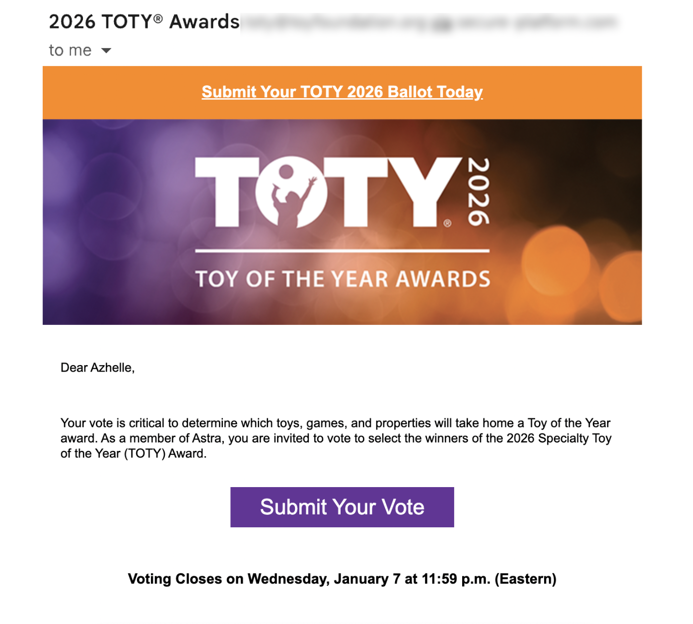 Members of ASTRA the specialty toy organization are welcome to vote for the Specialty Toy Of The Year award and invited via email. It looks like this ➡️